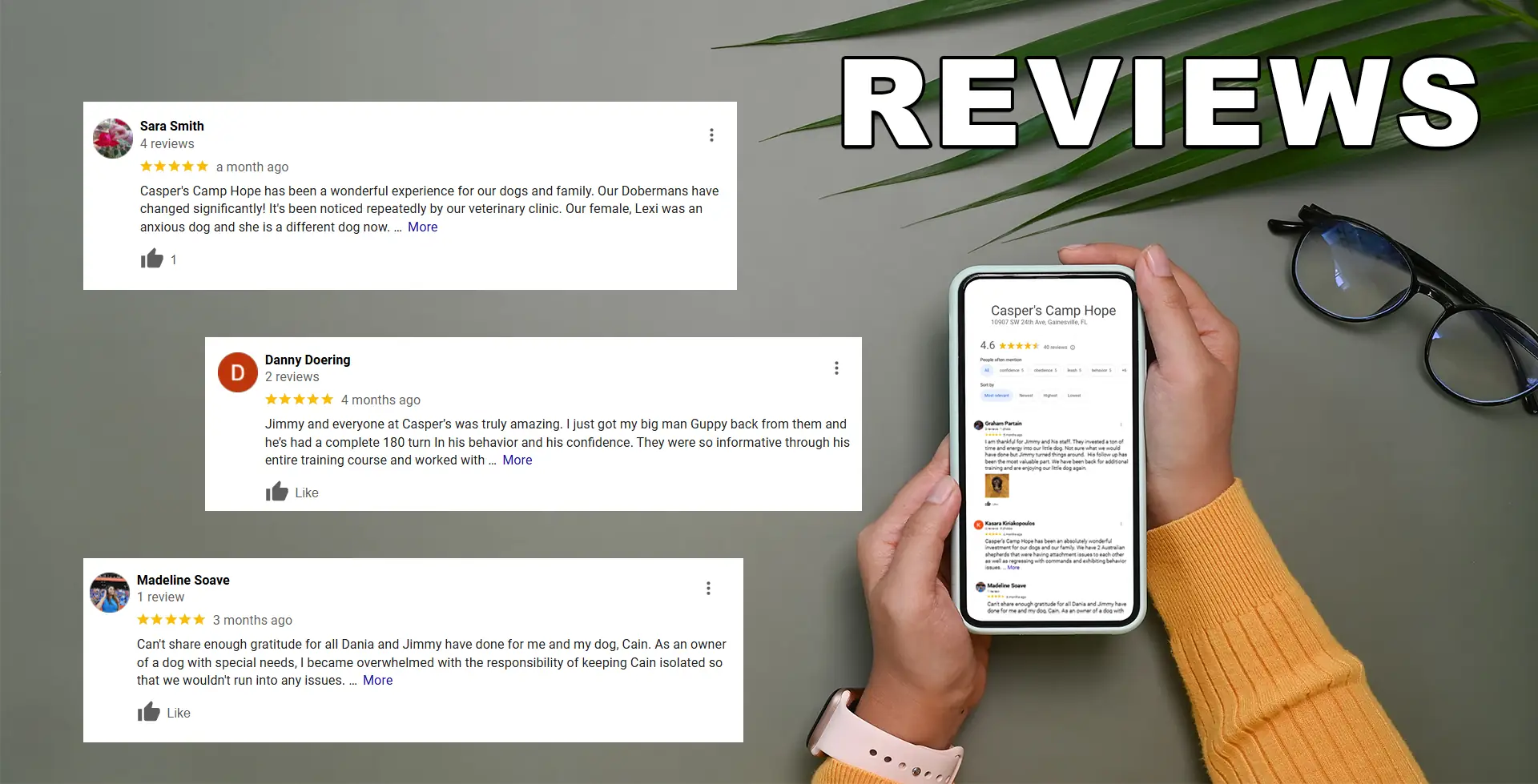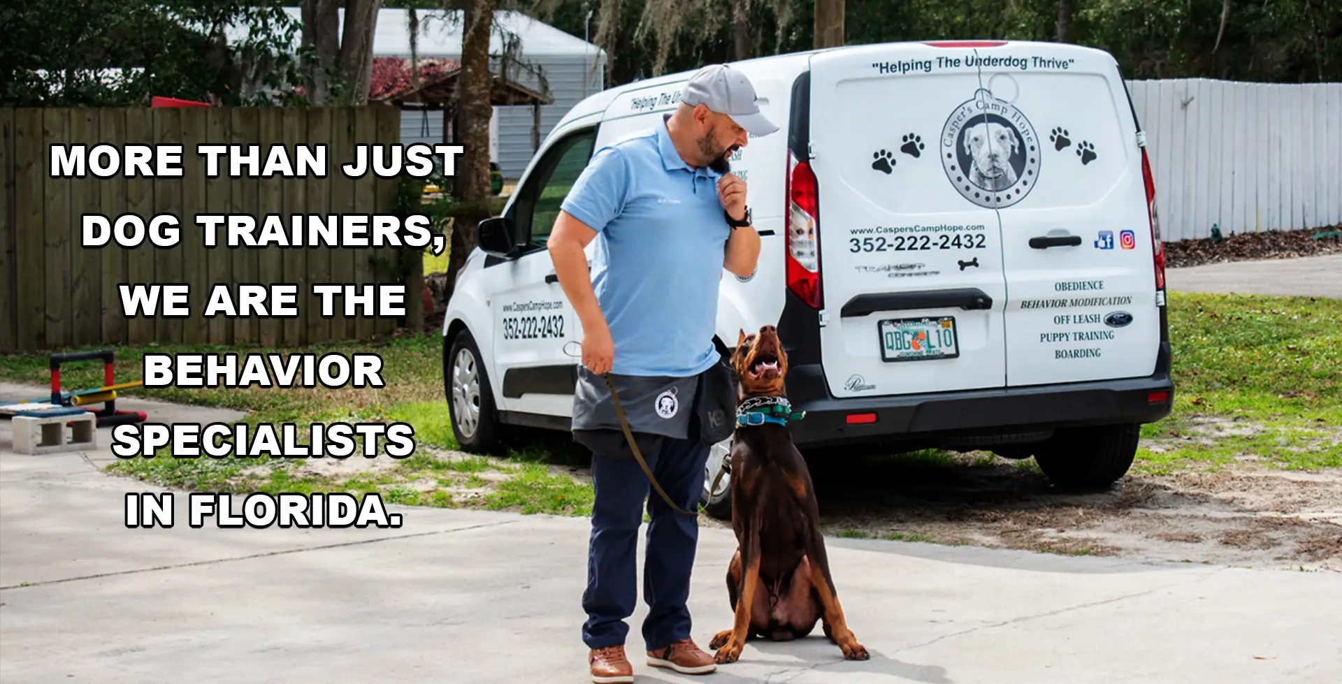 Welcome to Casper’s Camp Hope – Florida’s trusted dog training and behavior specialists. We specialize in helping dogs with severe behavioral issues, reactivity, aggression, and obedience challenges. Does your dog need some manners? Does he ignore you in the park, pull on the leash, rush at and jump on guests, chew furniture, bark incessantly? These are just a few of the things we can help you with! Whether you’re looking for reactive dog training, behavior modification, or a certified dog trainer, we’re here to help your furry friend thrive. Schedule your free consultation today and discover how we can transform your dog’s behavior!